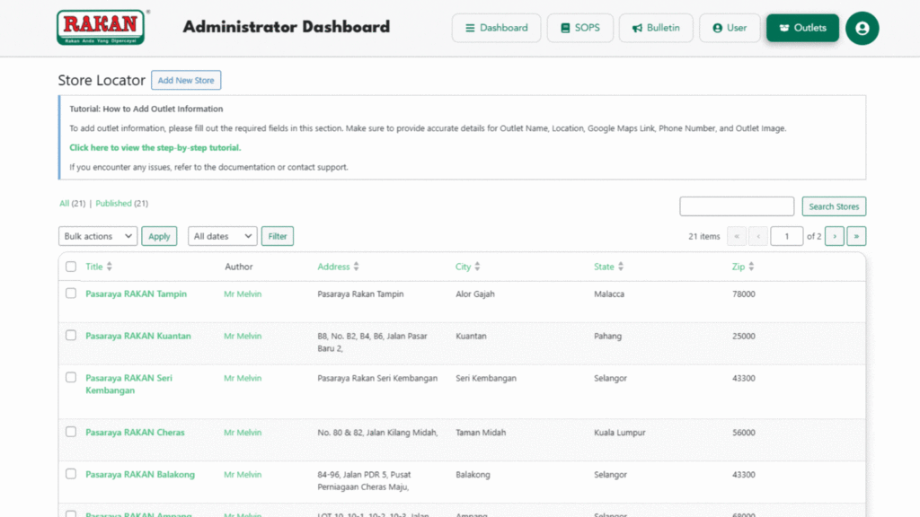 The Administrator Dashboard allows you to manage outlet information for RAKAN stores. Follow the steps below to add or edit outlet details.